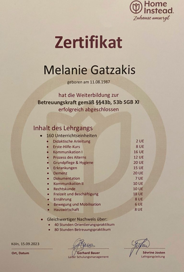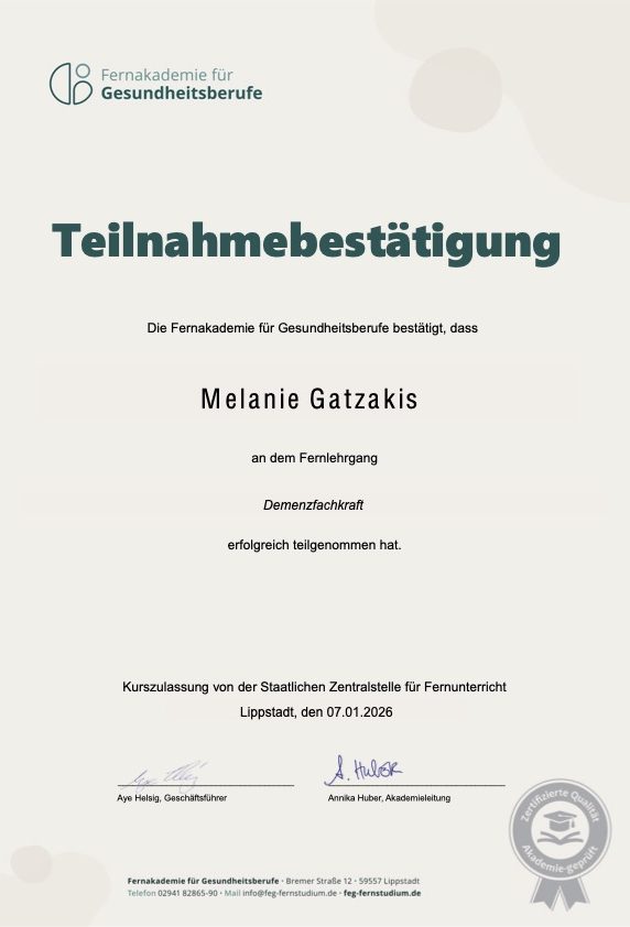 Als zertifizierte Betreuungskraft und Demenzfachkraft lege ich großen Wert auf eine qualifizierte und respektvolle Begleitung von Senior*innen und ihren Angehörigen.